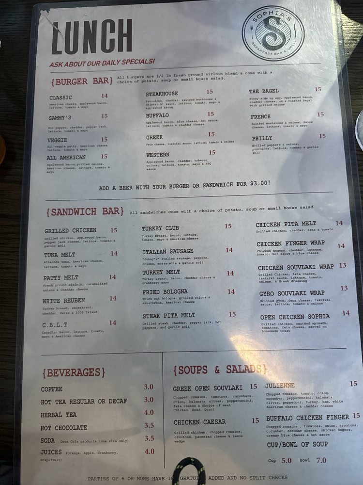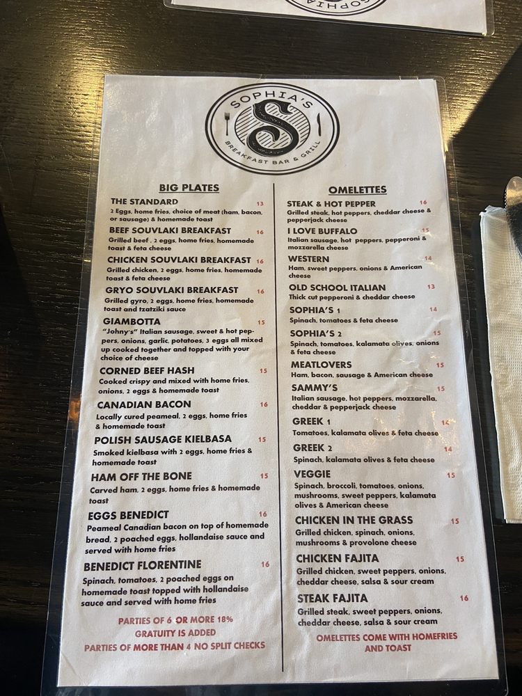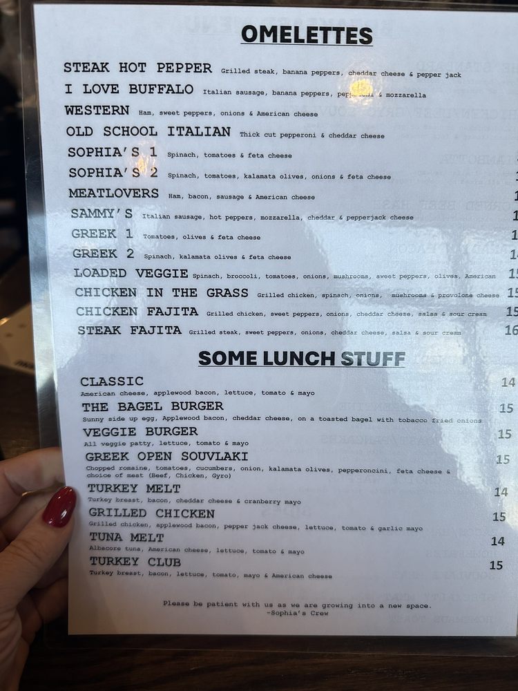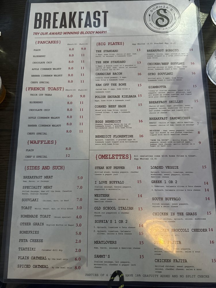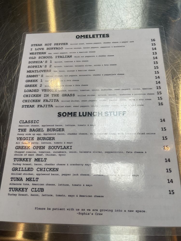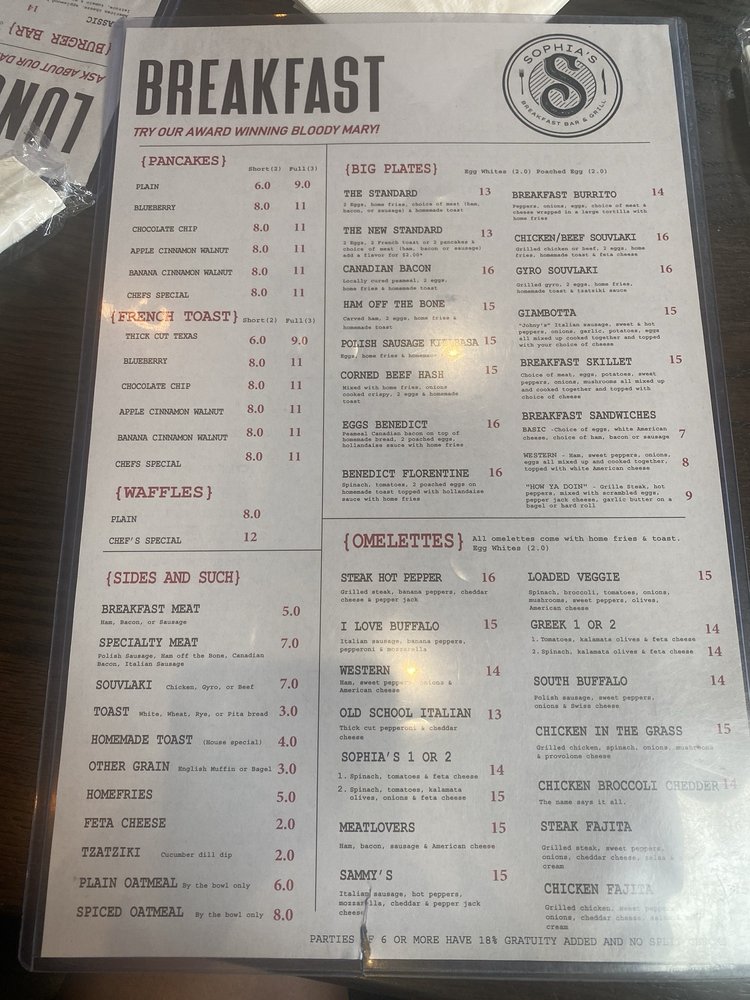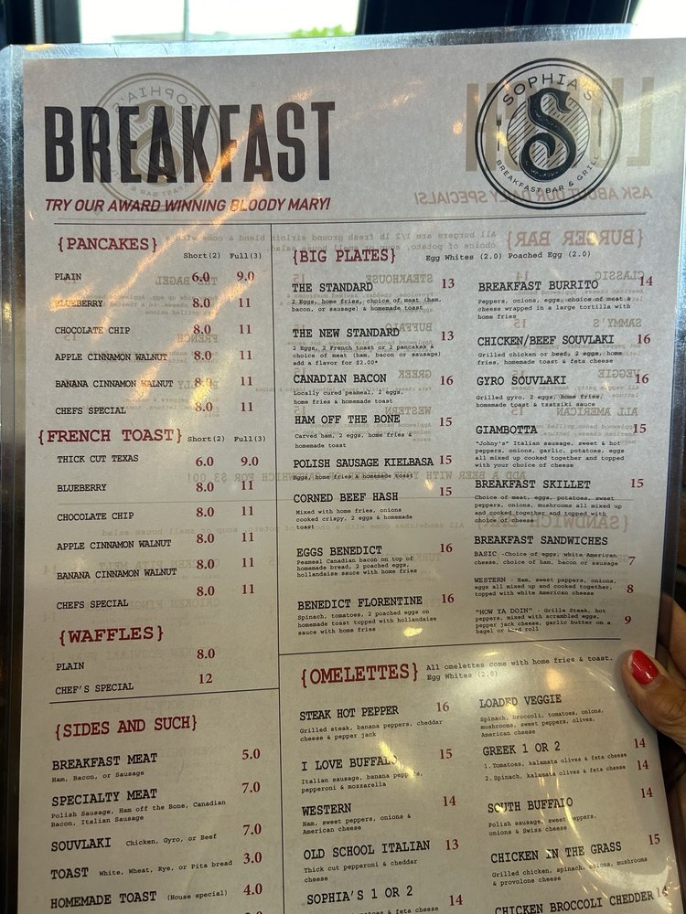 Sophia's Restaurant in Buffalo, NY offers a diverse menu with options for everyone. From Chef Salad to Gyro Souvlaki, the soups, salads, and omelets are a hit among customers. The Western Omelet and Loaded Veggie Omelet come recommended for their delicious flavors. The service is exceptional, with attentive staff and a welcoming atmosphere. Customers rave about the quality and portion sizes of the food, like the chocolate chip pancakes and gyro souvlaki breakfast. The restaurant's new location is welcoming and spacious, with outdoor seating available. With a commitment to quality and customer satisfaction, Sophia's Restaurant is a must-visit for those looking for a satisfying meal experience.